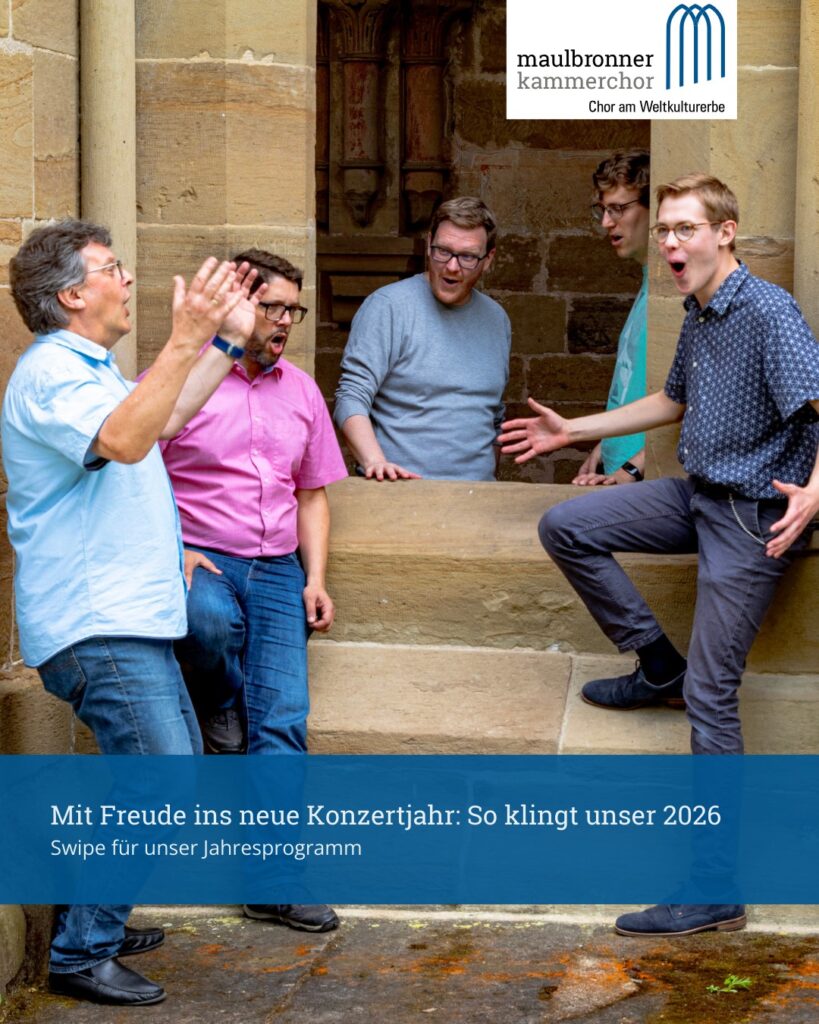 Schön, dass du hier bist! Hier gibt es alle Informationen rund um den Maulbronner Kammerchor, was bei uns ansteht und wie du mitmachen kannst. Unter Über uns findest du alles zum Chor und unter Künstlerischer Leiter alles über unseren Dirigenten Benjamin Hartmann.